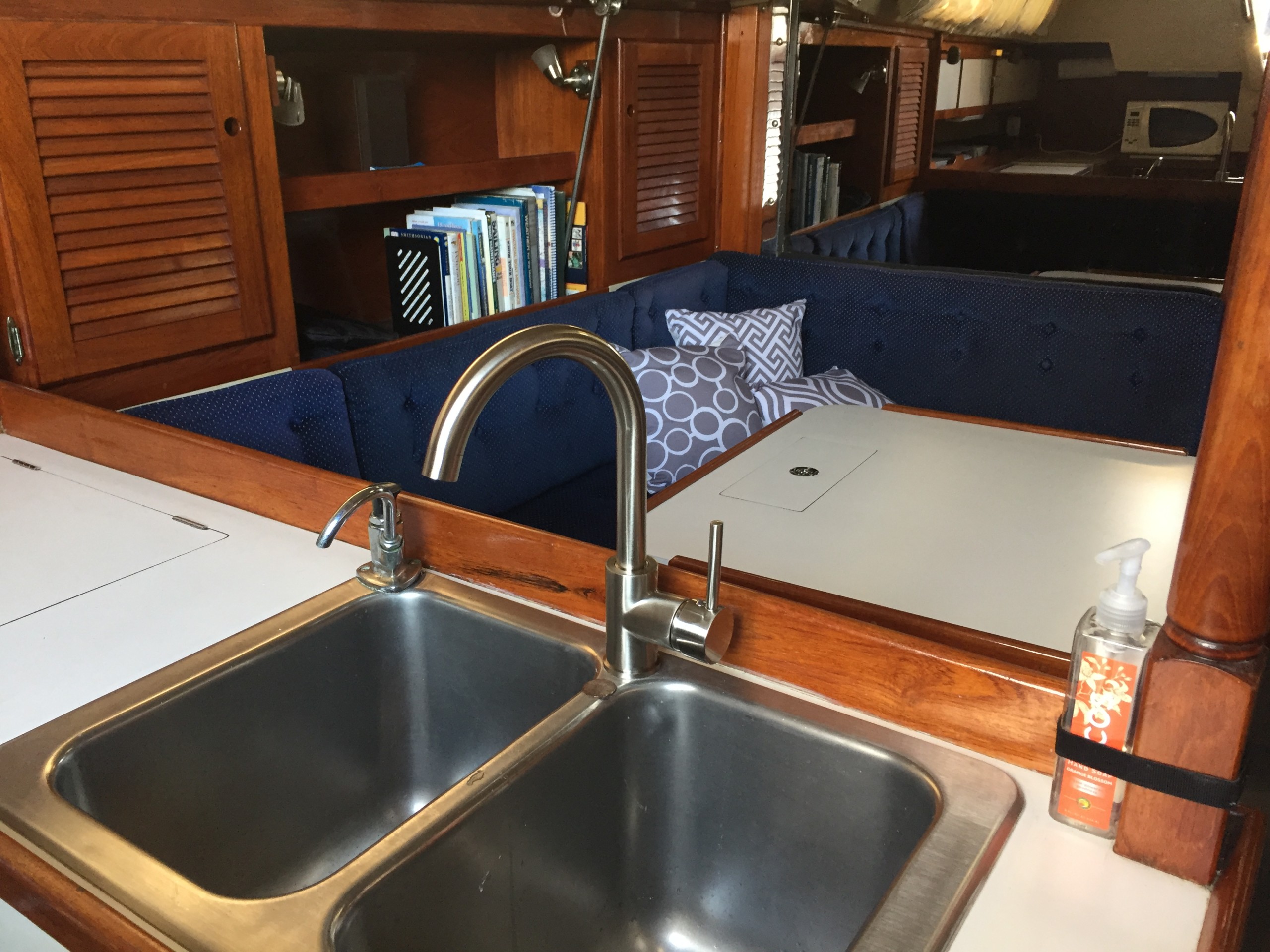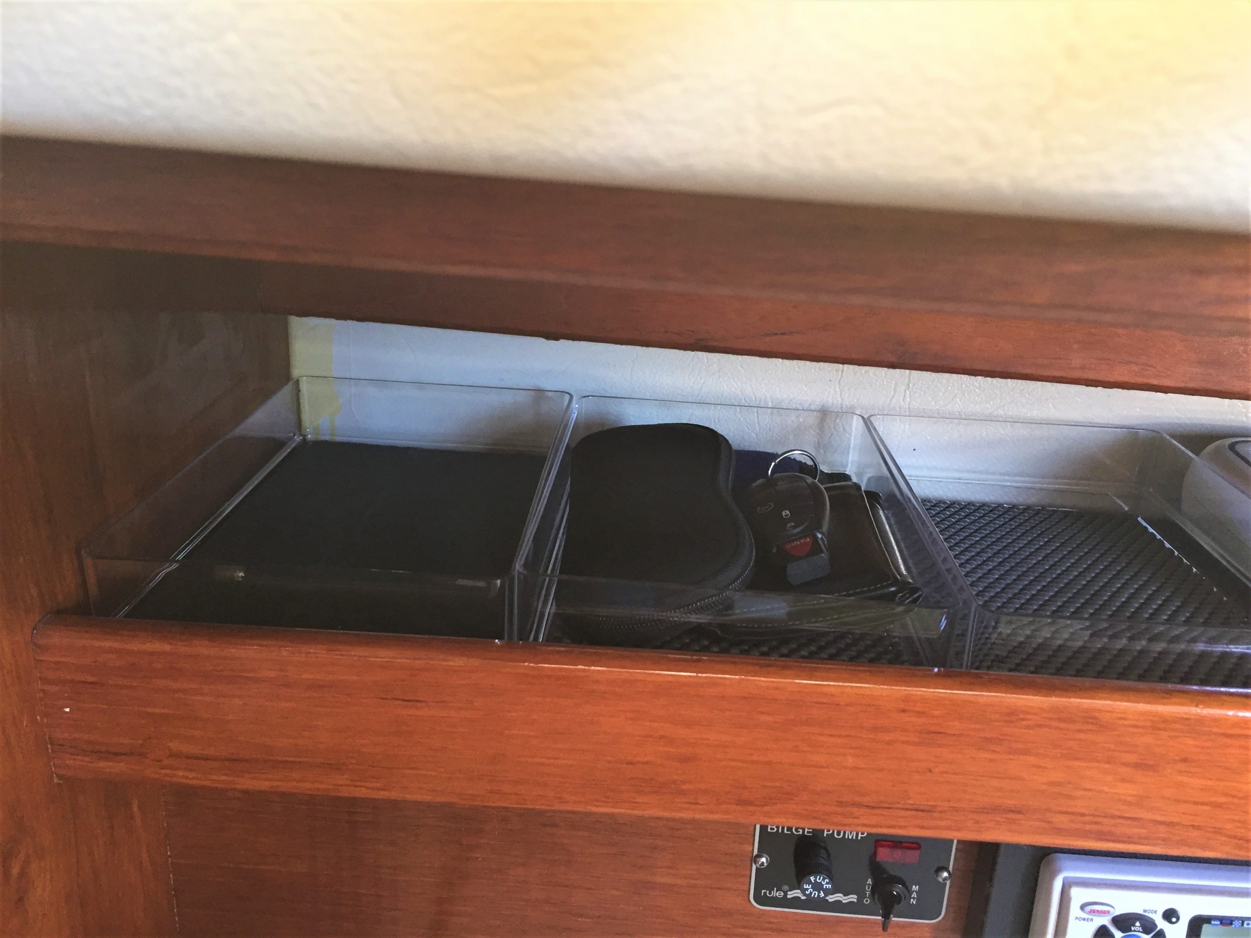 Keeping the skipper organized with bins above the navigation station.